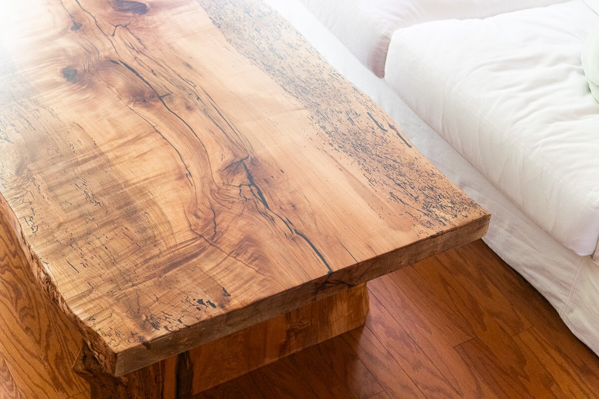 Features: Solid live-edge maple coffee table constructed from reclaimed New York wood. The top is a single 2 1/2 inch thick slab and the legs are also 2 1/2 inches thick and come from the same tree.